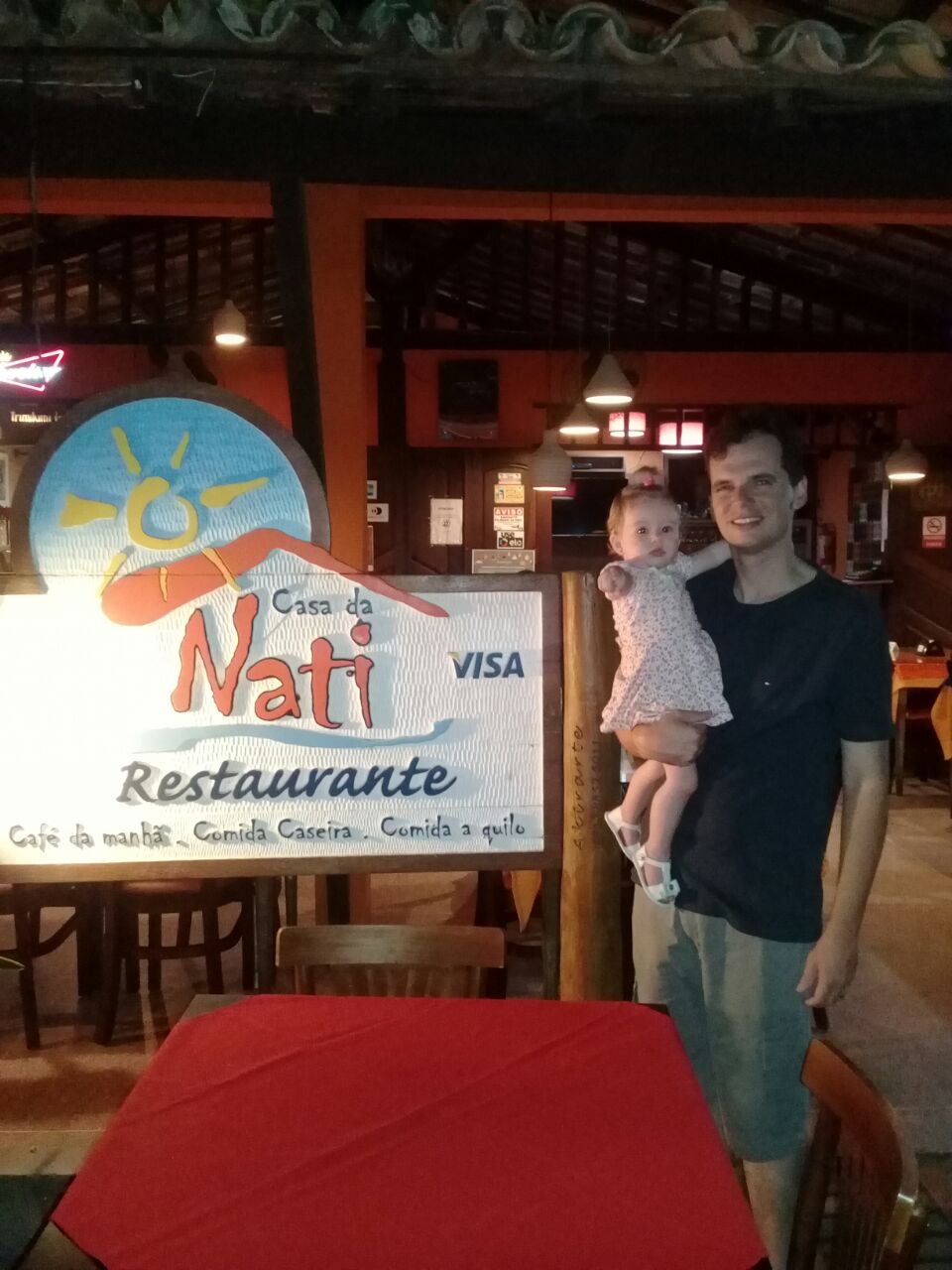 À noite, a visita obrigatória é nessa vila da praia, por sinal muito tranquila, com muitas famílias passeando com seus filhos e policiais à vista fazendo a vigia. Jantamos em um restaurante de comida italiana e, no outro dia, almoçamos no Restaurante Casa da Nati, por coincidência com o mesmo nome da nossa filha. Era no estilo buffet por quilo ao valor de R$ 68 e com muitas variedades de comida. A Natália adorou, deu gosto de ver ela comer!
