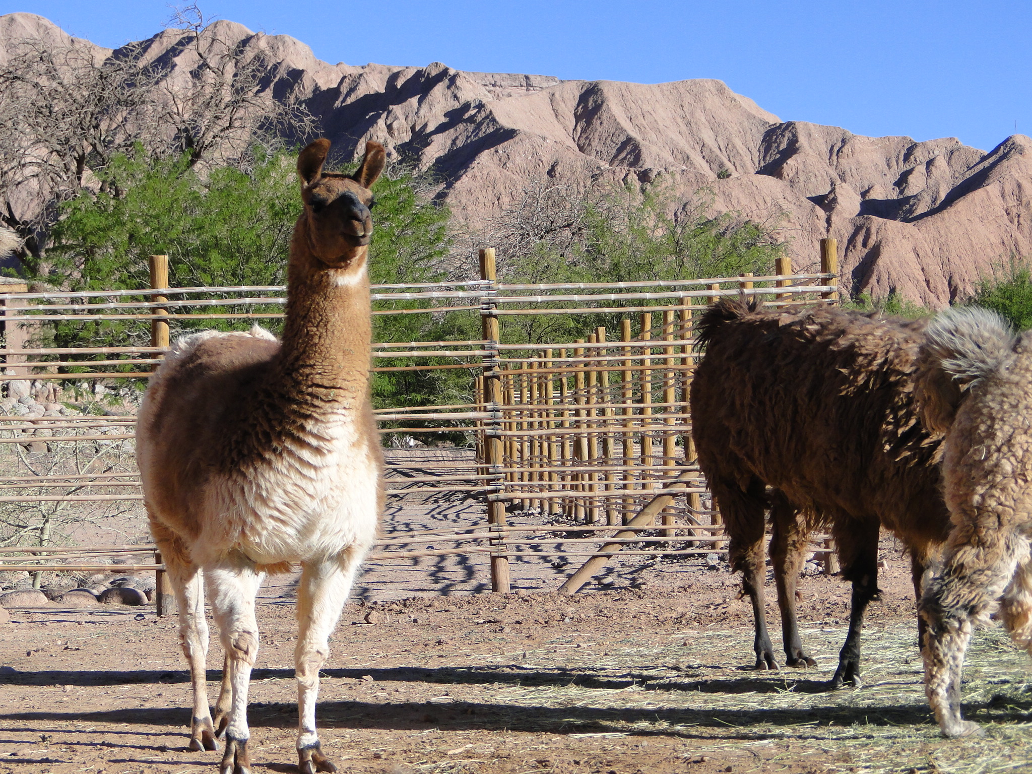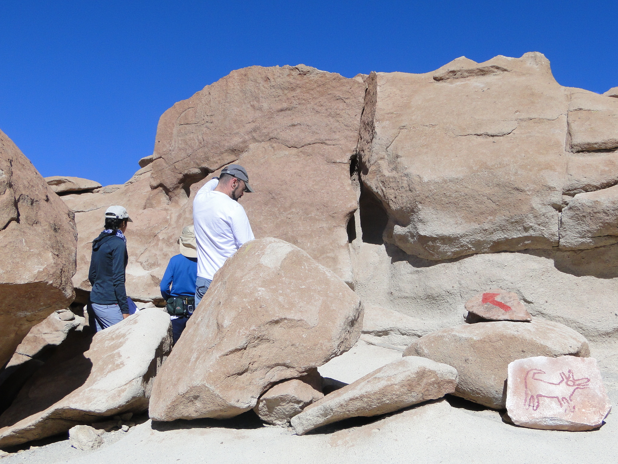Na manhã seguinte partimos de van rumo às montanhas do Vale do Arco-Íris, onde fica um sítio arqueológico com pinturas rupestres. O longo percurso de quase uma hora pelo deserto é exuberante, e pelo caminho cruzamos por rebanhos de lhamas, vicunhas, alpacas, guanacos e burros, todos selvagens (as crianças adoraram!). Essas pinturas rupestres são bem concentradas em pedras rochosas onde é possível escalar, mesmo com crianças pequenas (naquele esquema, um segura o outro faz a ponte e vamos indo montanha a cima). Após as explicações históricas sobre o local, seguimos para um passeio mais geológico por meio de vales e montanhas frutos de erosões milenares. As crianças foram muito bem com água, barrinha de cereal e muito protetor solar. A saber: em todas as paradas nos pontos turísticos há uma espécie de quiosque com banheiros, água potável, assentos e um local para informações. Os guias também carregam nas vans água e barra de cereal para os passageiros.