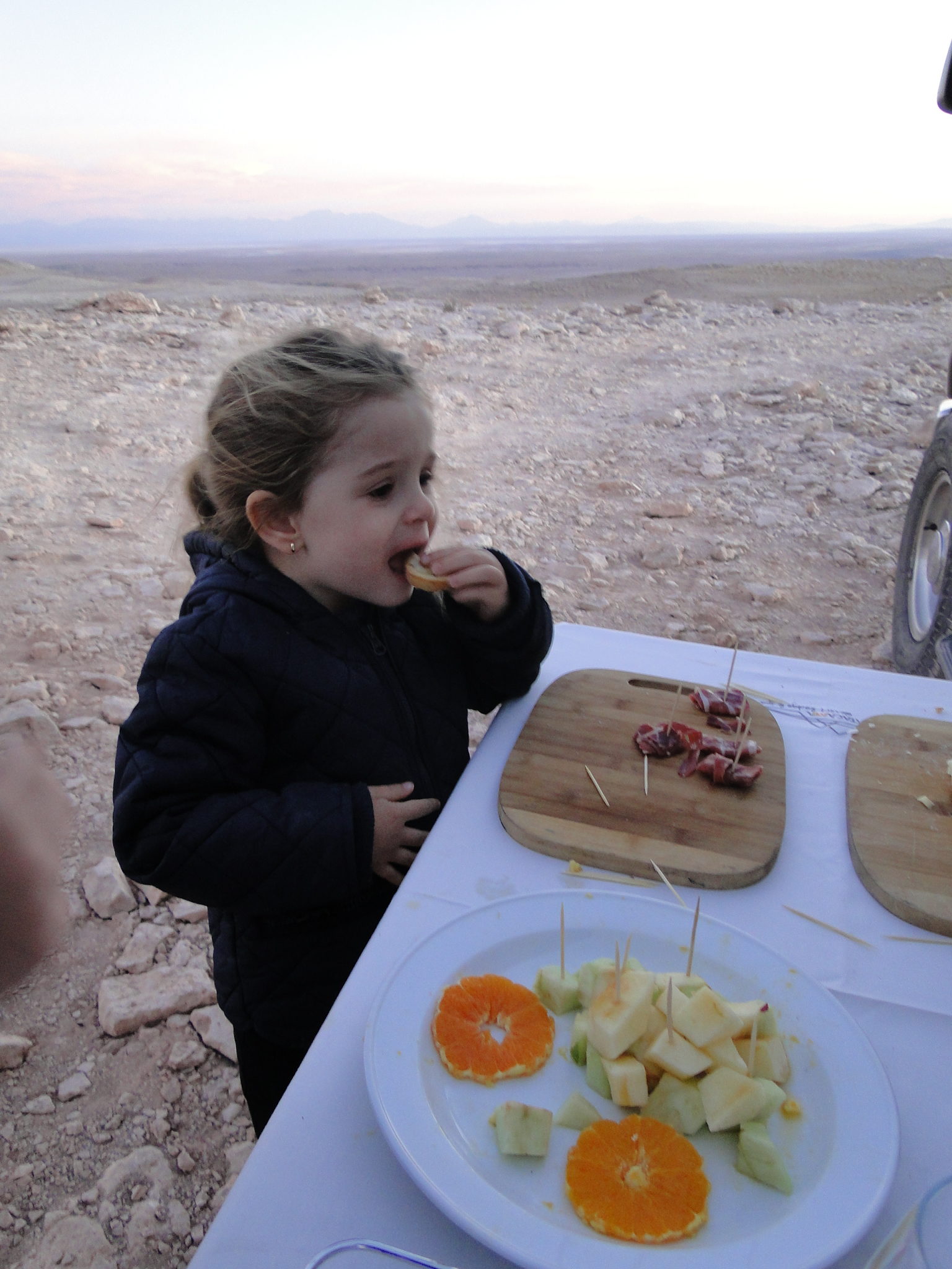 Durante o dia chegou a fazer 24ºC graus, e, à noite, 4ºC . Além dos itens já mencionados, não esqueça de levar um gorro, cachecol e uma boa jaqueta. O vento nas montanhas do Atacama é lacerante. Opte por levar botas leves para os pequenos, já que os tênis enchem de areia com o vento do deserto. E esqueça qualquer possibilidade de roupas fofas ou com frufrus: elas voltam tão sujas depois de um dia no deserto que, acredite, você pensa seriamente em jogá-las no lixo.
